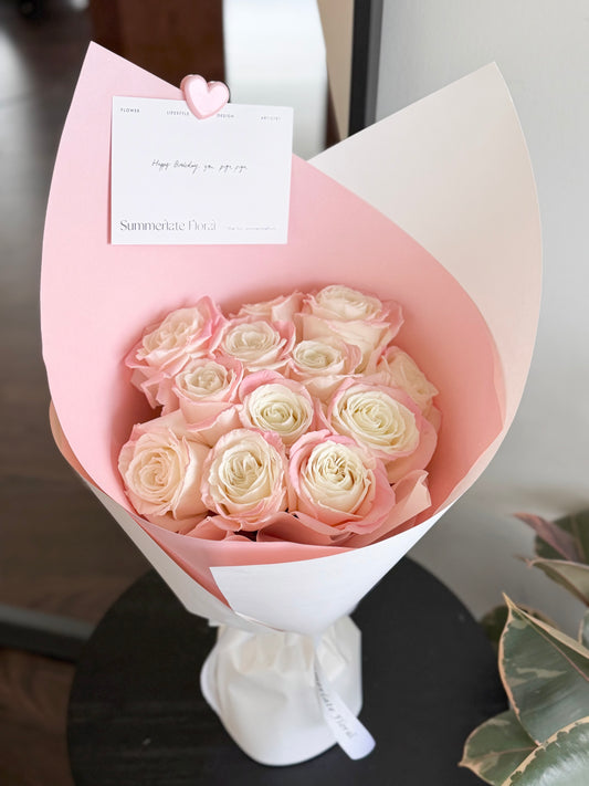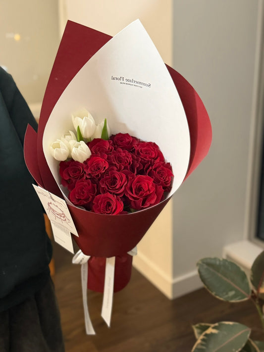 From classic red roses to soft blush tones and modern romantic palettes, each bouquet is thoughtfully composed with premium blooms and refined textures.