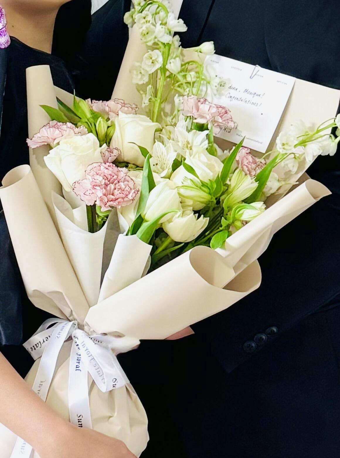 I ordered a graduation bouquet for my spouse, and it turned out beautifully, the base of the bouquet was a brilliant idea! Sherry was very easy to communicate with throughout the process, making everything smooth and stress-free. I was able to get the flowers right on schedule. And they really know how to make the day feel extra special—thank you for the lovely arrangement!